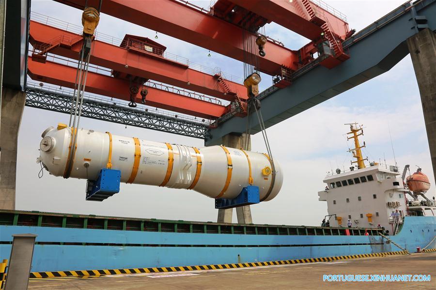 Fotos de 17 de outubro de 2017 mostram o gerador de vapor Hualong One ZH-65 sendo i?ado para embarque em Guangzhou, capital da província de Guangdong, no sul da China. Na ter?a-feira, o gerador de vapor de ponta desenvolvido no país partiu para o primeiro projeto de energia nuclear de demonstra??o usando a tecnologia Hualong One, um projeto de reator de terceira gera??o desenvolvido no país.