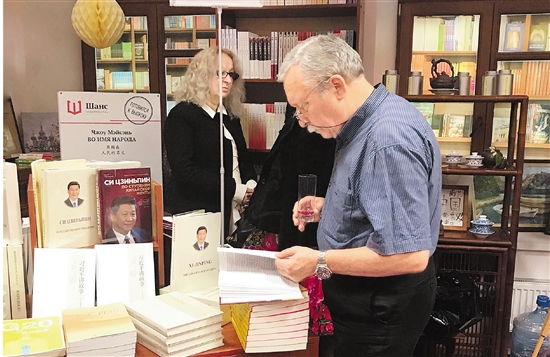 Um russo lê a vers?o chinesa de “Xi Jinping: A Governan?a da China”, na Chance Bookuu, no centro de Moscou, a 3 de julho. A Semana Cultural da China e uma exposi??o de livros relacionados com a Chin…