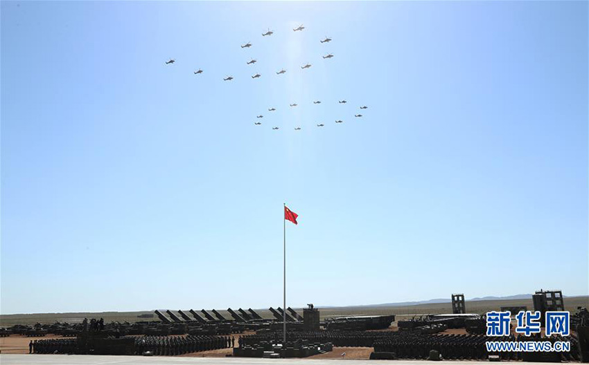 Zhurihe, Mongólia Interior, 30 jul (Xinhua) -- Escal?es de helicópteros sobrevoaram a tribuna de revista em um desfile militar no domingo, na base de treinament…