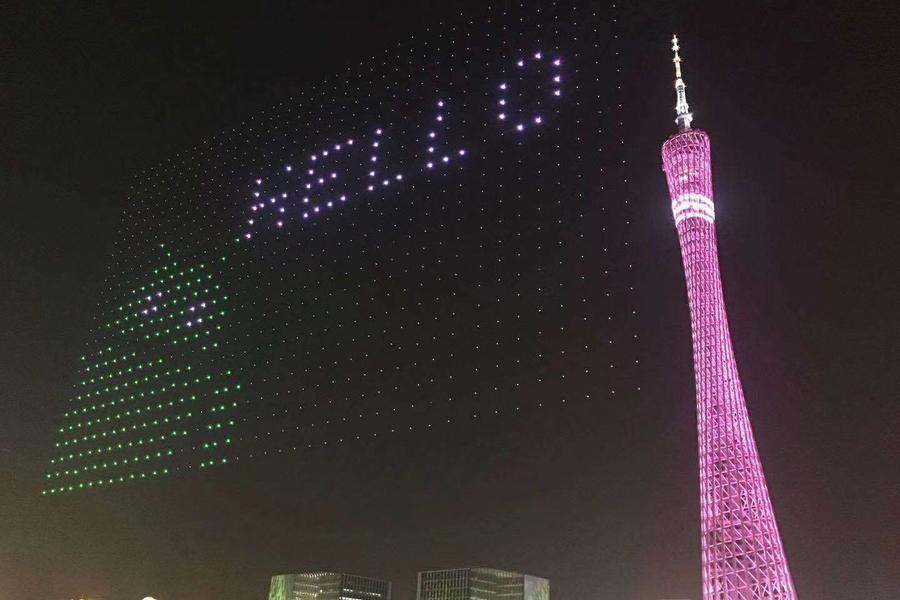 Um total de 1.180 drones realizaram uma forma??o luminosa com os dois caracteres chineses “財(cái)富” (Fortune) para receber o Fórum Global da Fortune em Guangzhou, batendo o recorde mundial de 1.