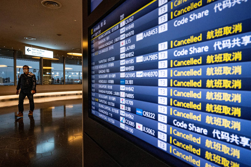 Um visitante (E) caminha próximo à tela que exibe informa??es de chegada e cancelamento de voos no Aeroporto Haneda de Tóquio, em 27 de dezembro de 2020. O primeiro-ministro japonês Yoshihide Suga …