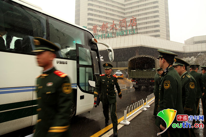 BEIJING, 2 de mar (Diário do Povo Online) - às 8 horas de manh? do último sábado, os soldados da For?a da Polícia Armada de Beijing come?aram a estar de plant?o nos hotéis que hospedam os delegados da APN e os membros da CCPPCh, de modo a iniciar a miss?o de seguran?a das sess?es anuais de 2015.