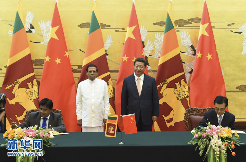 BEIJING, 27 de mar (Diário do Povo Online) – O presidente chinês, Xi Jinping, reuniu-se ontem (26) no Grande Palácio do Povo com o seu homólogo do Sri Lanka, Maithripala Sirisena, que está na China para uma visita oficial e para a participa??o da Reuni?o Anual 2015 do Fórum de Bo’ao para a ásia. Depois do encontro, os dois presidentes testemunharam a assinatura dos documentos cooperativos nas áreas como a infraestrutura e saúde.