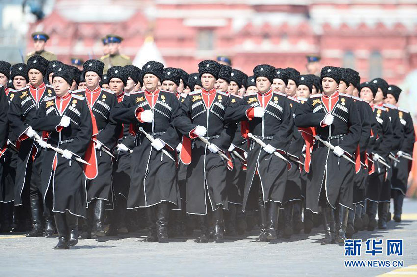 No início da parada, o ministro da Defesa da Rússia, Sergei Shoigu, passou a revista às unidades desfiladas, incluindo 10 fileiras estrangeiras. A guarda de honra da China, composta por 102 membros, foi o maior forma??o das unidades desfiladas estrangeiras. Os soldados chineses passaram pela Pra?a Vermelha com acompanhamento da música russa Katyusha, uma can??o bem conhecida na Rússua durante a Segunda Guerra Mundial.
