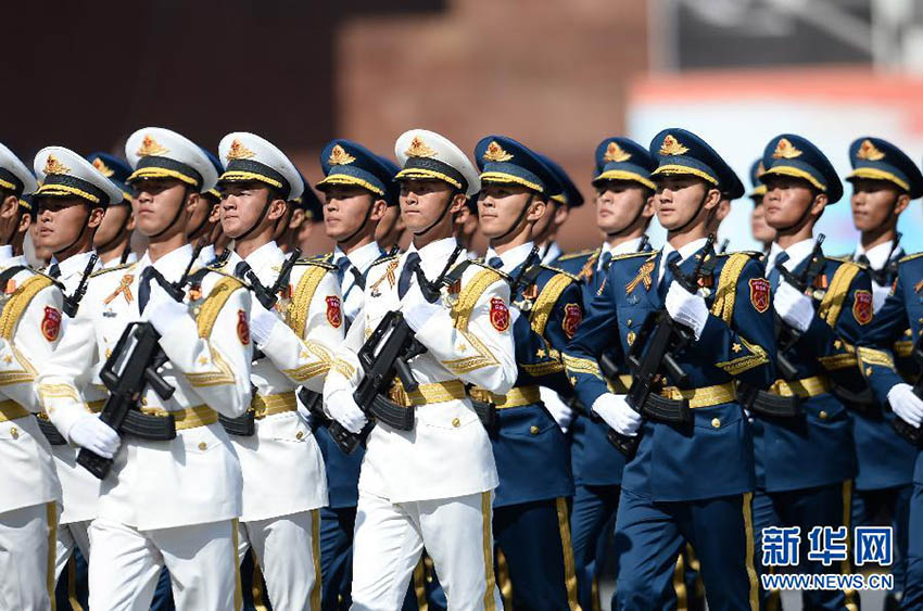 No início da parada, o ministro da Defesa da Rússia, Sergei Shoigu, passou a revista às unidades desfiladas, incluindo 10 fileiras estrangeiras. A guarda de honra da China, composta por 102 membros, foi o maior forma??o das unidades desfiladas estrangeiras. Os soldados chineses passaram pela Pra?a Vermelha com acompanhamento da música russa Katyusha, uma can??o bem conhecida na Rússua durante a Segunda Guerra Mundial.