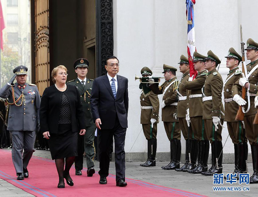 Antes de entrar na residência presidencial, Li Keqiang passou em revista a guarda de honra do Chile com o acompanhamento do hino nacional da China. A presidente Bachelet deu boas vindas a Li Keqiang no portal, e depois acompanhou o premiê chinês a entrar na residência presidencial e passer em revista a guarda presidencial.