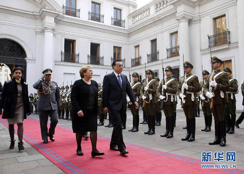 Antes de entrar na residência presidencial, Li Keqiang passou em revista a guarda de honra do Chile com o acompanhamento do hino nacional da China. A presidente Bachelet deu boas vindas a Li Keqiang no portal, e depois acompanhou o premiê chinês a entrar na residência presidencial e passer em revista a guarda presidencial.