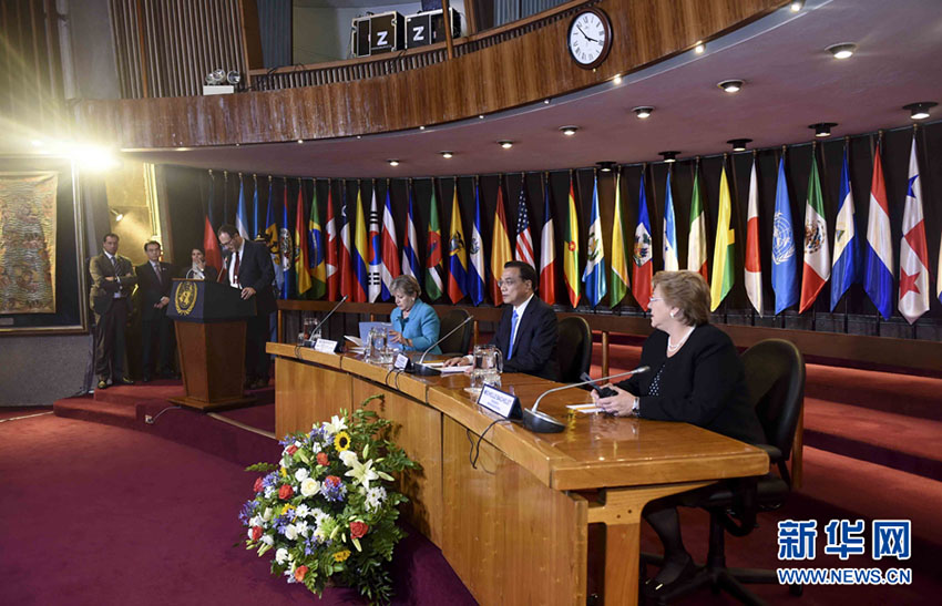 Na tarde do dia 25, horário local, o primeiro-ministro chinês, Li Keqiang, ora na visita no Chile, fez um discurso em Santiago na Comiss?o Econ?mica das Na??es Unidas para a América Latina e o Caribe (CEPAL). A sua esposa Cheng Hong, a presidente chilena, Michelle Bachelet, a secretária executiva da CEPAL, Alicia Barcena, compareceram no evento.