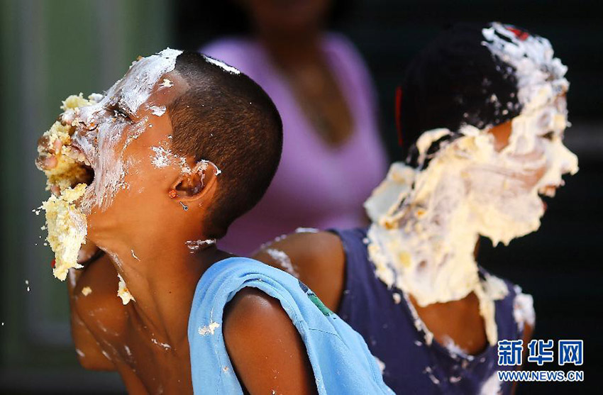 Meninos comem bolo na atividade comemorativa do 450o aniversário da funda??o da cidade de Rio de Janeiro. (1 de mar?o, 2015)