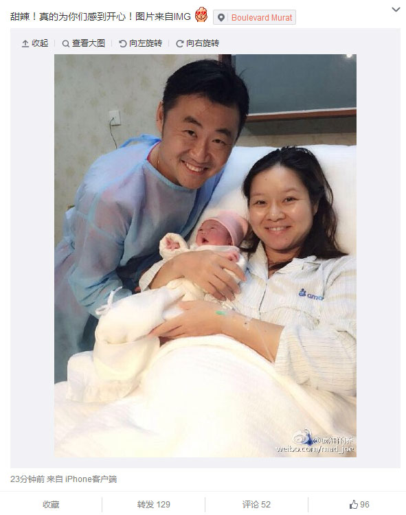 “O marido Jiang Shan e eu vamos apresentar Alisa a nossos f?s. Ficamos muito contentes e nos apaixonamos por ela”, disse Li Na em Weibo.