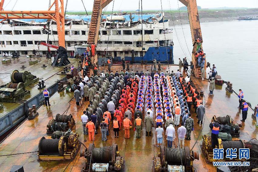 às 9h, o ministro do Transporte da China, Yang Chuantang, declarou a abertura da cerim?nia. Toda equipe de resgate parou o trabalho, tirou os chapéus e virou a cabe?a em dire??o ao Estrela do Oriente, junto com os familiares das vítimas e jornalistas. Enquanto isso, todas embarca??es ligaram os apitos por 3 minutos, incluindo os barcos que estavam passando pelo local que desaceleraram e ligaram seus apitos.