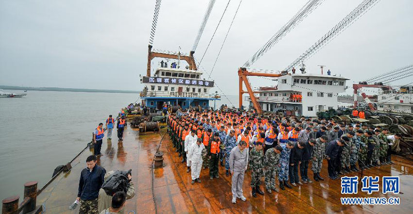às 9h, o ministro do Transporte da China, Yang Chuantang, declarou a abertura da cerim?nia. Toda equipe de resgate parou o trabalho, tirou os chapéus e virou a cabe?a em dire??o ao Estrela do Oriente, junto com os familiares das vítimas e jornalistas. Enquanto isso, todas embarca??es ligaram os apitos por 3 minutos, incluindo os barcos que estavam passando pelo local que desaceleraram e ligaram seus apitos.