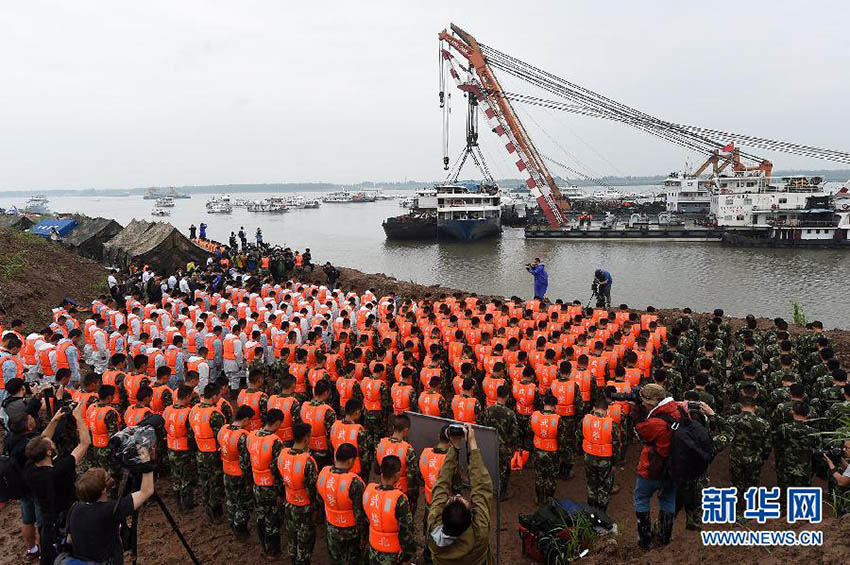 às 9h, o ministro do Transporte da China, Yang Chuantang, declarou a abertura da cerim?nia. Toda equipe de resgate parou o trabalho, tirou os chapéus e virou a cabe?a em dire??o ao Estrela do Oriente, junto com os familiares das vítimas e jornalistas. Enquanto isso, todas embarca??es ligaram os apitos por 3 minutos, incluindo os barcos que estavam passando pelo local que desaceleraram e ligaram seus apitos.