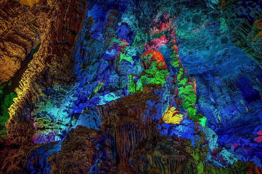 Formada há 180 milh?es de anos, a Caverna de Flauta de Cana situa-se na profundidade a mais de 240 metros da superfície da Terra e as inscri??es nas paredes podem datar da Dinastia Tang, em 792 d.C. Graham fotografou as paisagens maravilhosas de cores de arco-íris na caverna, incluindo azul cristal, vermelho fogo e verde claro, entre outras.