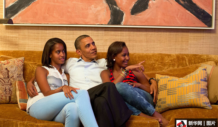 O presidente dos EUA, Barack Obama, acompanha suas duas filhas a assistirem TV. (4 de setembro, 2012)