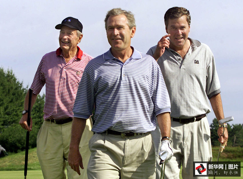 George W. Bush (centro) está com seu irm?o mais jovem Jeb Bush (direita) e seu pai George Herbert Walker Bush (esquerda). (7 de julho, 2001)