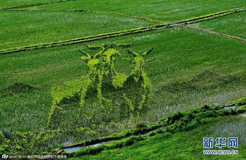 Segundo se informou, a etnia Xibe tem a tradi??o de criar pinturas nos arrozais para fazer ora??es. Com desenhos pré-concebidos, as pinturas usam a tecnologia de 3D e fluoroscopia para plantar arroz de vários tipos com ervas de cores diferentes, a fim de criar pinturas de estilos plano, tridimensional, perfurado e linear.