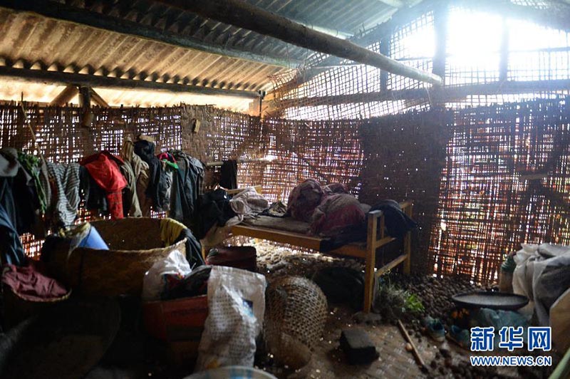 Abrindo uma porta velha, o repórter conseguiu ver a parte interna da casa, que é dividia em dois espa?os, à esquerda é um estábulo para bovinos com muito cheiro e à direita, é o quarto para pessoas. Sob a ilumina??o do celular, pode se ver uma cama, que é composta por uma tábua de madeira nos quatro tijolos. Sem mesa nem cadeira, a parede da casa foi defumada em preto. Isto é a casa de Er Ri Shu Jin, um residente da etnia Li que mora em uma vila pobre e remota da Província de Sichuan, no sudoeste da China.