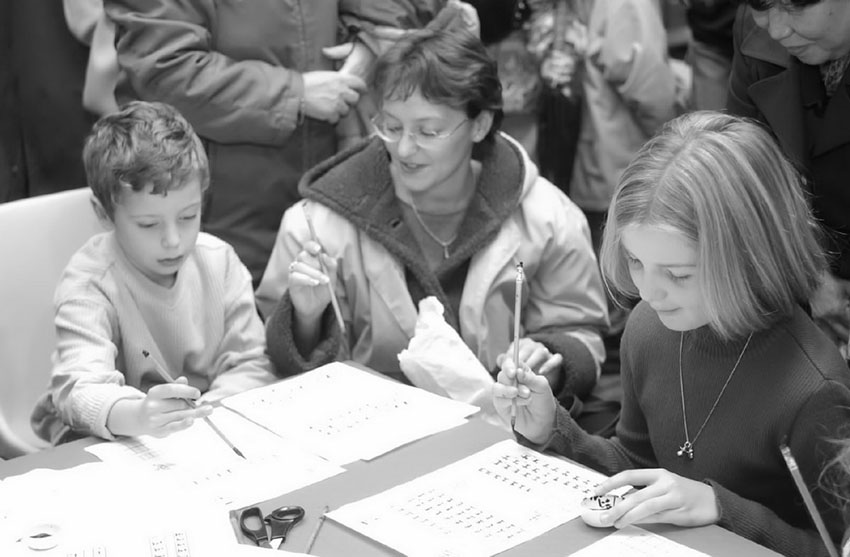 2. Pais e crian?as belgas aprendem a caligrafia chinesa durante a “Semana da Cultura Chinesa” realizada em Bruxelas, capital da Bélgica. (16 de novembro, 2002)