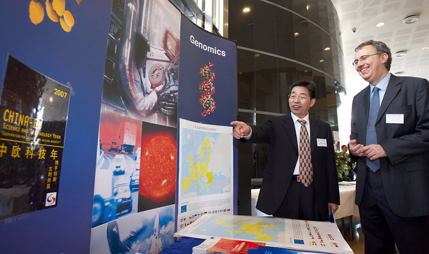 4. Um especialista chinês (à esquerda) está conversando com seu colega europeu na exposi??o do Ano da Tecnologia China-EU, realizada na sede da UE, em Bruxelas. (11 de outubro, 2006)