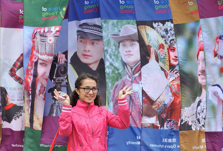 7. Uma mulher europeia posa ao lado das bandeiras com fotos que demonstram jovens chineses na frente do edifício do Parlamento Europeu, em Bruxelas. (9 de setembro, 2011)