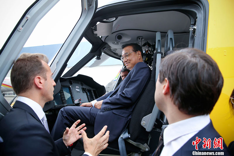 Os dois líderes embarcaram um helicóptero fabricado pela China e Fran?a. Li Keqiang perguntou sobre as características técnicas e atua??o do helicóptero. Segundo o responsável do projeto, a metade das pe?as foram fabricadas pelas empresas chinesas. Os dois premiês ainda trocaram opini?es sobre a futuro coopera??o aeroespacial sino-francesa.