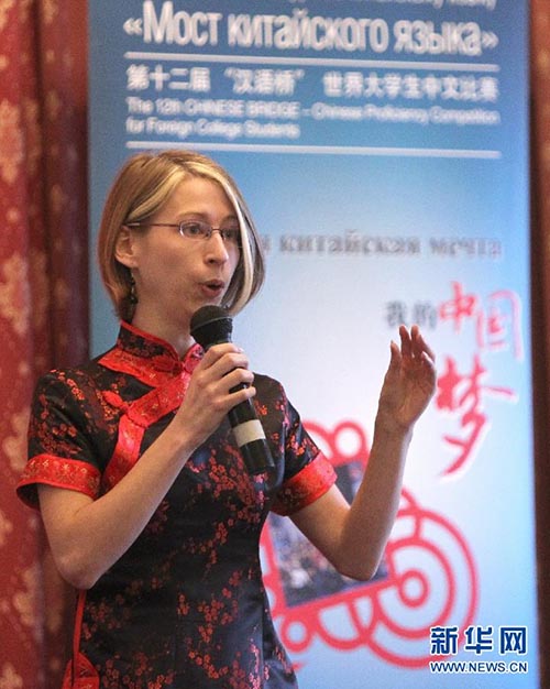 Uma estudante universitária recita poesia em chinês na 12o Concurso “Chinese Bridge” realizada em S?o Petersburgo, na Rússia. (30 de abril, 2013)