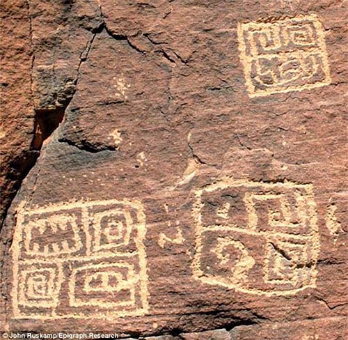 O químico aposentado e pesquisador da epígrafe, John Ruskamp, do Estado de Illinois, descobriu as marca??es incomuns quando estava passeando no Monumento Nacional de Petrografia em Albuquerque, no Estado do Novo México. Ele afirmou que as marca??es indicam que os povos antigos da ásia eram presentes nas Américas por volta de 1.300 a.C. - quase 2.800 anos antes de os navios de Colombo terem atravessado pelo Novo Mundo e atingirem ao Caribe em 1492.