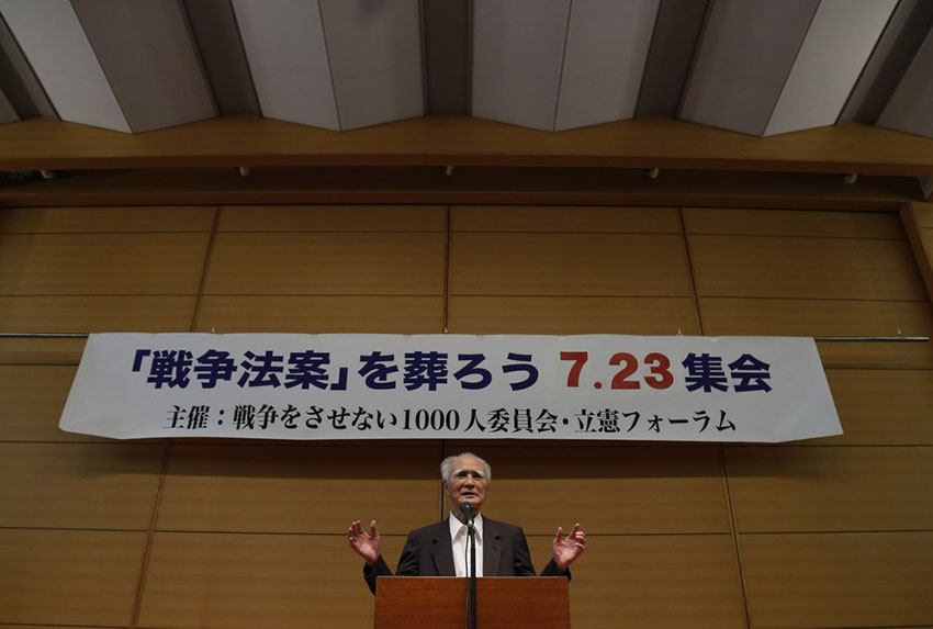 O ex-primeiro-ministro japonês, Tomiichi Murayama, fez no dia 23 um discurso público em frente ao prédio do congresso japonês para manifestar seu protesto contra o governo de Shinzo Abe, que ignora as opini?es do povo e aprovou for?adamente o projeto de lei de seguran?a na Casa dos Representantes.