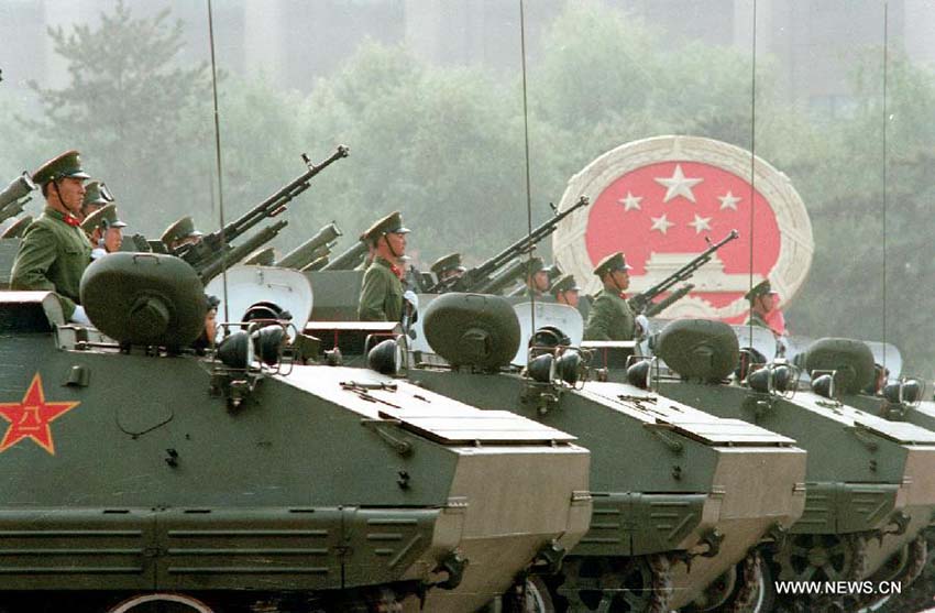 1984: veículos blindados e militares do EPL participam na parada de celebra??o do 35o aniversário da funda??o da República Popular da China, na Pra?a da Paz Celestial de Beijing.