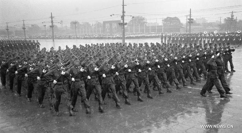 Soldados do EPL em parada de celebra??o do 7o aniversário da funda??o da República Popular da China, na Pra?a da Paz Celestial de Beijing. foto tirada em 1956.