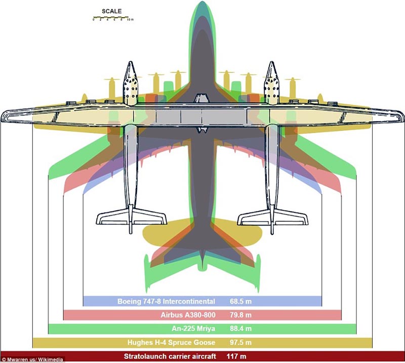 Após a conclus?o, a aeronave terá 222 toneladas de peso, com uma envergadura de cerca de 117 metros de largura, 37,5 metros a mais do que o Airbus A380, podendo lan?ar o foguete na atitude de 9000 metros. No princípio, o Stratolaunch poderá lan?ar um satélite de 6,1 kgs à orbita até 2000 kms da Terra e no futuro, o avi?o é projetado para lan?ar a aeronave espacial.