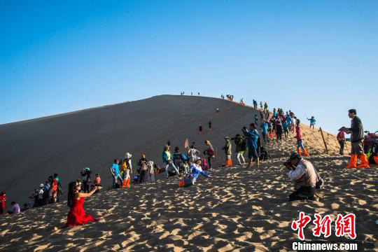 Segundo dados estatísticos, o número de turistas que visitaram a zona turística do Monte Mingsha atingiu, ter?a-feira (4), mais de 16 mil almas, aumentando 118,9% em compara??o com o mesmo período do ano passado, tendo no dia seguinte, quarta-feira (5), o número subido para o histórico recorde de 18 mil visitantes.