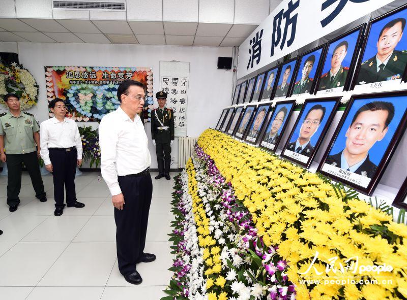 Na sala mortuária temporária na Zona Nova de Binhai, Li Keqiang guardou silêncio em homenagem aos bombeiros mortos no acidente. “Os bombeiros oficiais e n?o oficiais que morreram heroicamente no acidente assumiram as mesmas responsabilidades e devem ser tratados igualmente, com pens?o e honra iguais,” salientou o premiê.