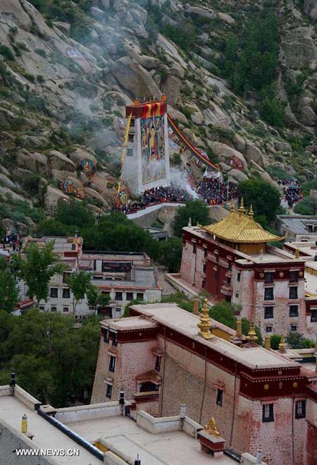 LHASA, 17 de agosto (Diário do Povo Online) - Mais de 200 mil budistas e outros crentes acorreram última sexta-feira (14) a Lhasa, capital da Regi?o Autónoma do Tibete, para celebrar o início do tradicional Festival de Shoton.