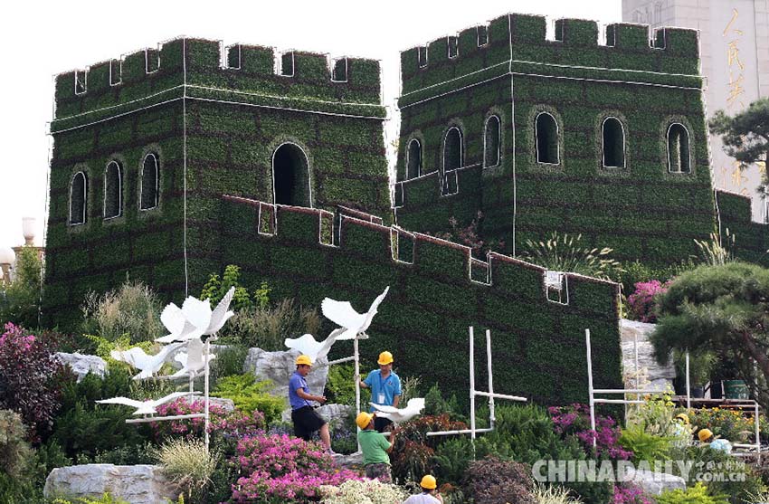 BEIJING, 19 de ago (Xinhua) - Canteiros de flores em forma da Grande Muralha decorar?o as cal?adas ao longo da Pra?a Tian'anmen, o local da parada militar em que participar?o tropas chinesas e estrangeiras no próximo mês.