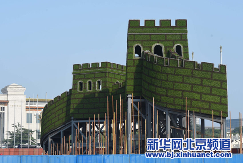 BEIJING, 19 de ago (Xinhua) - Canteiros de flores em forma da Grande Muralha decorar?o as cal?adas ao longo da Pra?a Tian'anmen, o local da parada militar em que participar?o tropas chinesas e estrangeiras no próximo mês.