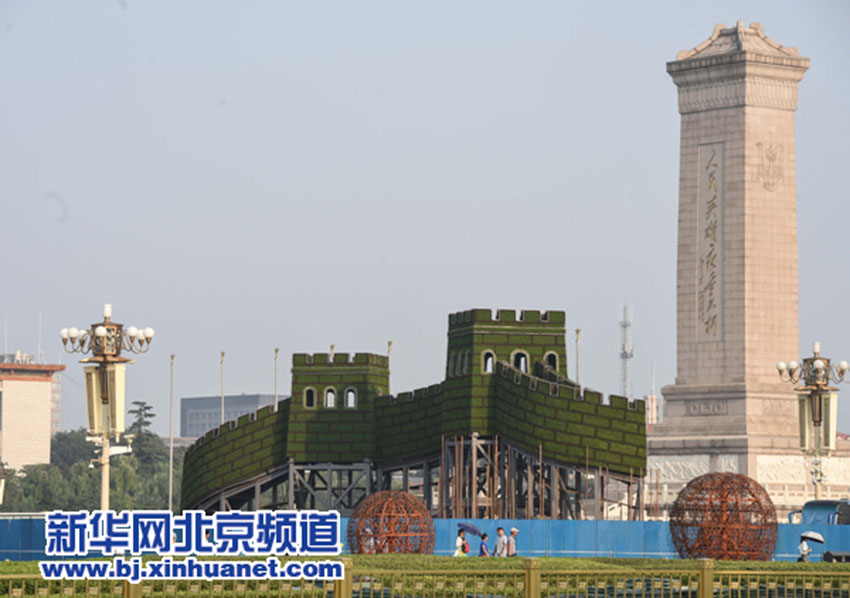 BEIJING, 19 de ago (Xinhua) - Canteiros de flores em forma da Grande Muralha decorar?o as cal?adas ao longo da Pra?a Tian'anmen, o local da parada militar em que participar?o tropas chinesas e estrangeiras no próximo mês.