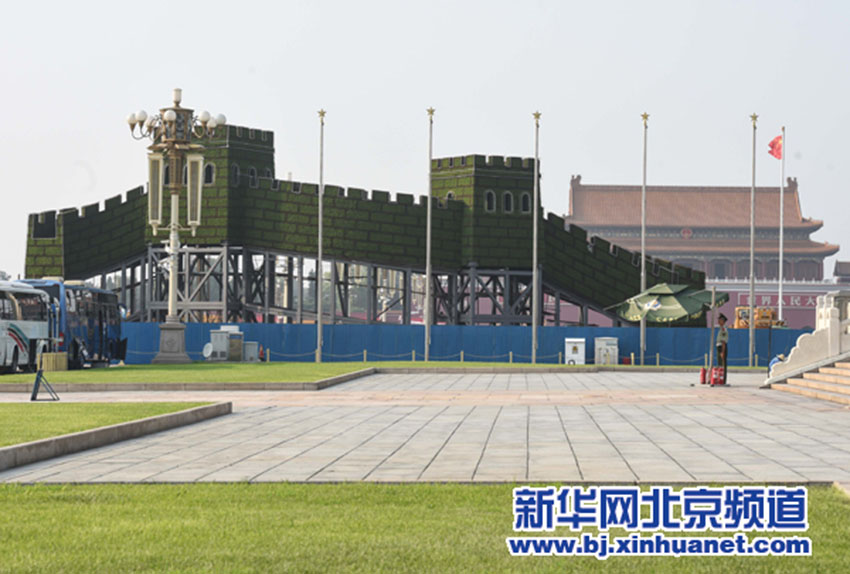 BEIJING, 19 de ago (Xinhua) - Canteiros de flores em forma da Grande Muralha decorar?o as cal?adas ao longo da Pra?a Tian'anmen, o local da parada militar em que participar?o tropas chinesas e estrangeiras no próximo mês.