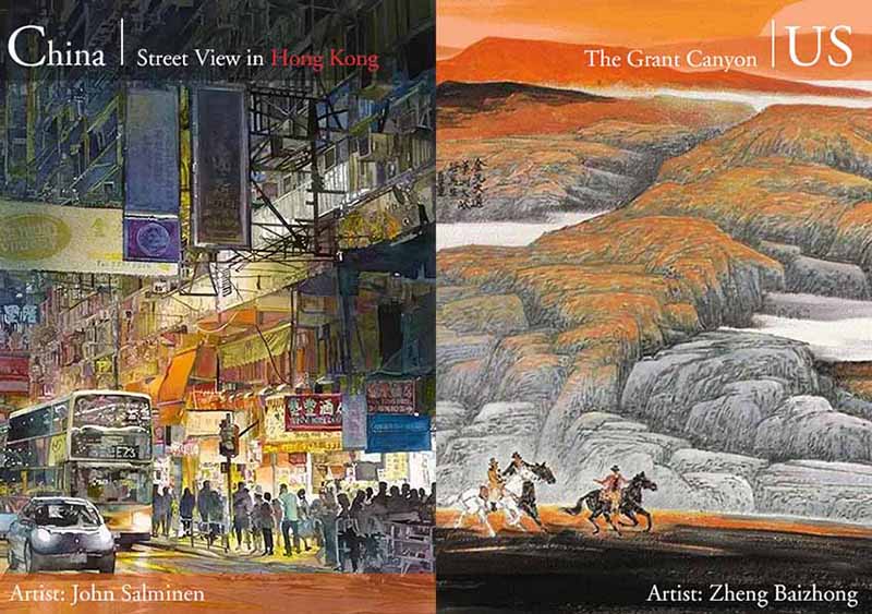 Vamos ver uma série de pinturas que mostram a compara??o da China na pintura norte-americana e os Estados Unidos na pintura dos chineses.
