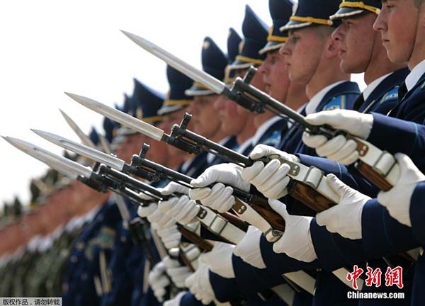 Bielorrússia: 22 de maio de 2007 - guarda de honra bielorrussa em parada militar em Minsk, a capital do país. Como for?a de elite das tropas bielorrussas, os membros da guarda de honra têm uma altura de pelo menos 185 centímetros (cm), aparência tipicamente eslava e excelente estado de saúde.