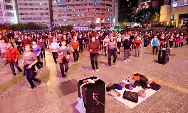 Dan?as de pra?a em áreas públicas é uma atividade comunitária popular entre os chineses, especialmente mulheres reformadas.