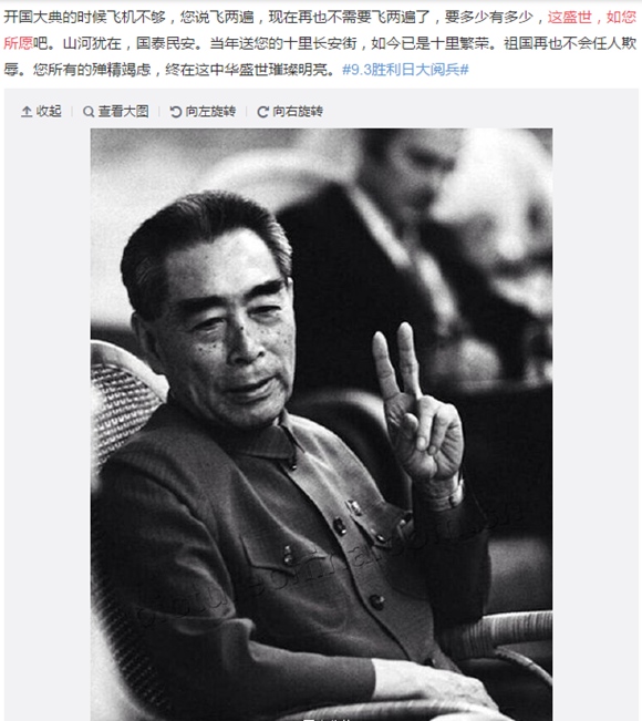 Após a grande parada militar de 3 de setembro de 2015, um post no weibo com a mensagem “Esta é a era de prosperidade, assim como gostarias que fosse”, acompanhada de uma foto do falecido primeiro-ministro Zhou Enlai, foi partilhada milh?es de vezes. Em 1949, aquando da cerimónia da implanta??o da Nova China, n?o haviam avi?es suficientes para formar uma esquadra para a inspe??o das tropas. Zhou sugeriu que os mesmos avi?es sobrevoassem sobre a Pra?a Tiananmen duas vezes.