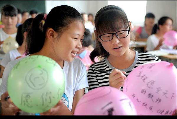 Alunos escrevem desejos e ben??es nos bal?es para os seus professores, na Escola Secundária Noo1 de Shucheng, na Província de Anhui, no leste da China, a 9 de setembro de 2015.