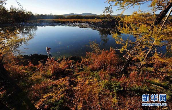 Foto tirada no dia 13 de setembro de 2015. Turista tirando fotos na Floresta Shitanglin em Arxan, no norte da Regi?o Aut?noma da Mongólia Interior.