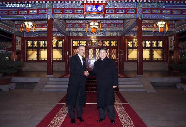 O presidente chinês Xi Jinping (à direita) reúne-se com o seu homólogo norte-americano Barack Obama em Zhongnanhai, em Pequim, capital chinesa, a 11 de novembro de 2014. Xi conversa com Obama, que estava fazendo uma visita de estado à China, depois de participar nas reuni?es econ?micas de líderes da APEC.