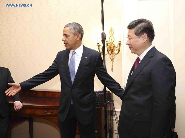O presidente chinês, Xi Jinping (à direita), reúne-se com o presidente norte-americano, Barack Obama, em Hague, na Holanda, a 24 de mar?o de 2014. O encontro foi realizado durante a Cimeira de Seguran?a Nuclear.