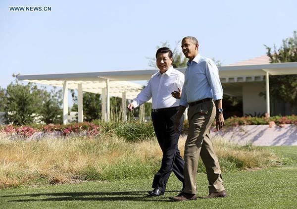 O presidente chinês Xi Jinping (à esquerda) e o presidente norte-americano Barack Obama d?o um passeio antes de come?ar a sua segunda reuni?o, em Annenberg Retreat, no Estado da Califórnia, nos Estados Unidos, a 8 de junho de 2013. O encontro foi realizado durante uma cimeira informal realizada em Sunnylands, no referido estado nos dias 7 de 8 de junho do mesmo ano.