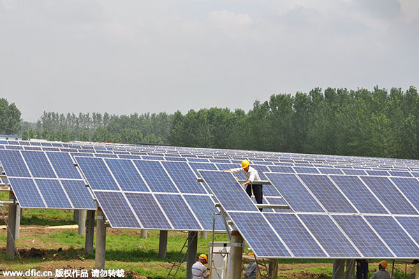 Operários instalam paineis solares no município de Donghai, província de Jiangsu, a 9 de agosto de 2015.