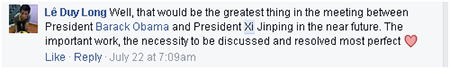 Lê Duy Long (Vietn?): O encontro entre o presidente norte-americano, Barack Obama, e presidente chinês, Xi Jinping, é muito importante. Os problemas e os assuntos quentes ser?o discutidos e resolvidos.